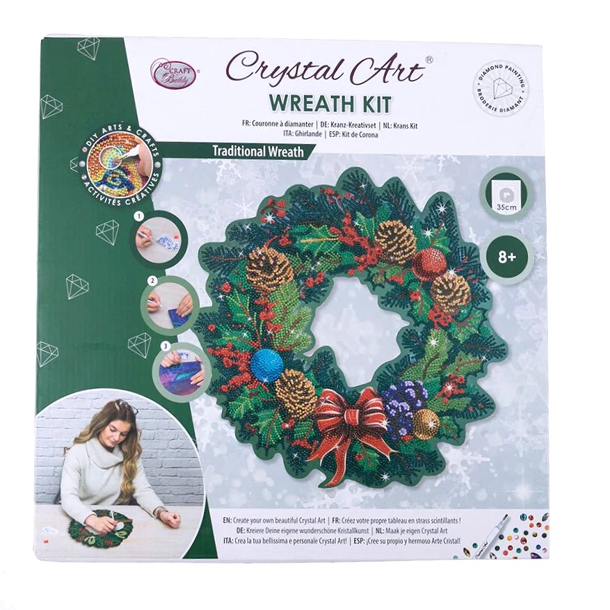 This elegant wreath features a classic Christmas design brought to life using the Crystal Art technique, where shimmering crystals are applied to a pre-printed adhesive surface. As you place each gem, the design gradually transforms into a rich, sparkling wreath full of colour, light, and festive detail.